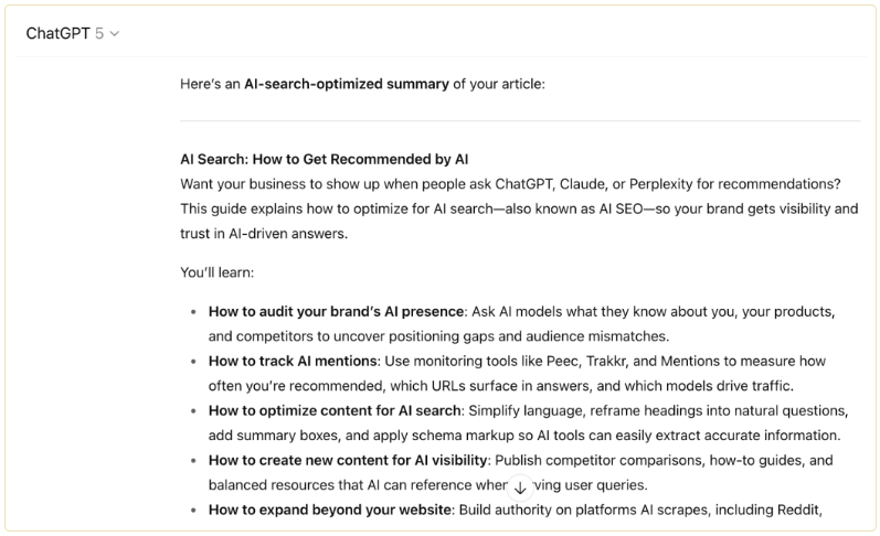 Πρόσθεσε ένα summary box στην κορυφή κάθε άρθρου για να δώσετε στα μοντέλα τεχνητής νοημοσύνης κάτι εύκολο να βρουν πληροφορίες. Αυτό το σθμμαρυ βοχ λειτουργεί σαν μια ενότητα TLDR (too long, too read). Θα πρέπει να περιέχει αυτά που πιστεύεις ότι είναι τα πιο σημαντικά σημεία του άρθρου και τι θέλεις η τεχνητή νοημοσύνη να καταλάβει από το άρθρο.