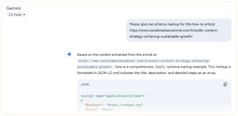 Τέλος, το schema markup ήταν πάντα σημαντικό στο παραδοσιακό SEO, αλλά για το AI Search optimization, γίνεται ολοένα και πιο σημαντικό να δίνεις στα μοντέλα τεχνητής νοημοσύνης σαφήνεια σχετικά με το τι περιέχει κάθε σελίδα. Για παράδειγμα, εάν έχεις ένα how-to post, θα μπορούσες να χρησιμοποιήσεις το how-to schema για να πείς στα μοντέλα τεχνητής νοημοσύνης ακριβώς τι είδους περιεχόμενο αναλύουν.